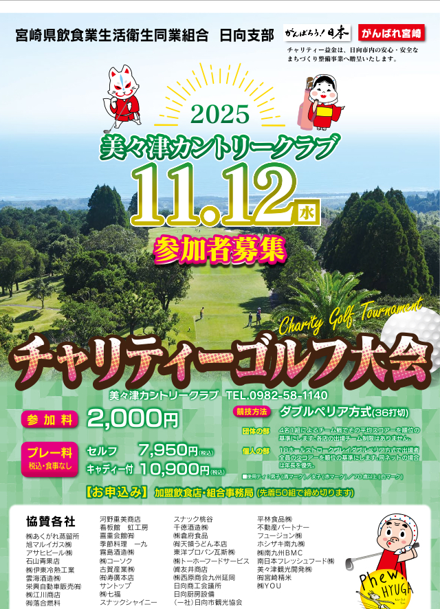 毎年恒例となった日向支部チャリティーゴルフコンペが11月12日水曜日に美々津カントリクラブにて開催されます。参加は自由ですので、県内屈指の歴史を持つ美々津カントリークラブでプレーしたい方は直接ゴルフ場へお問い合わせいただければ大丈夫です。